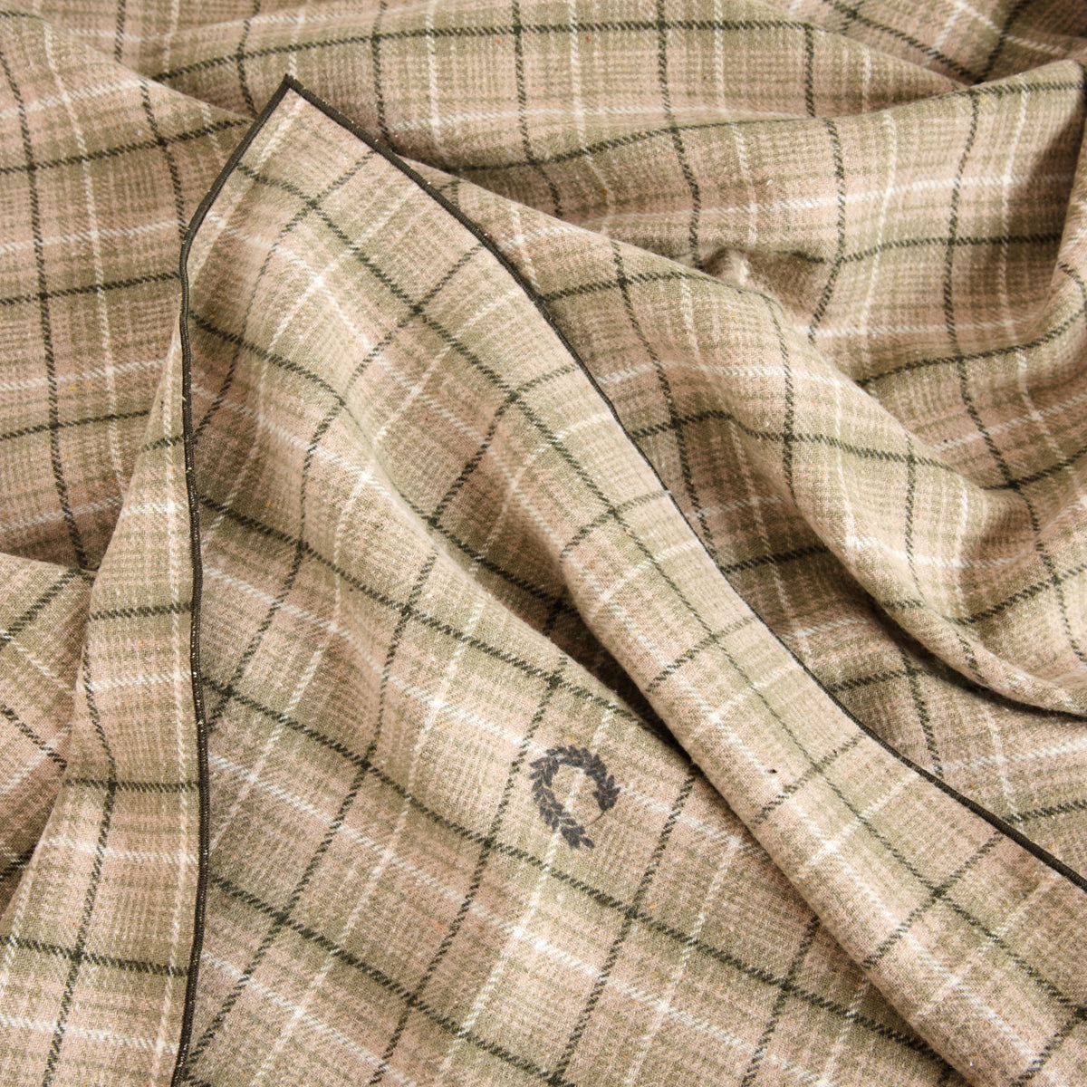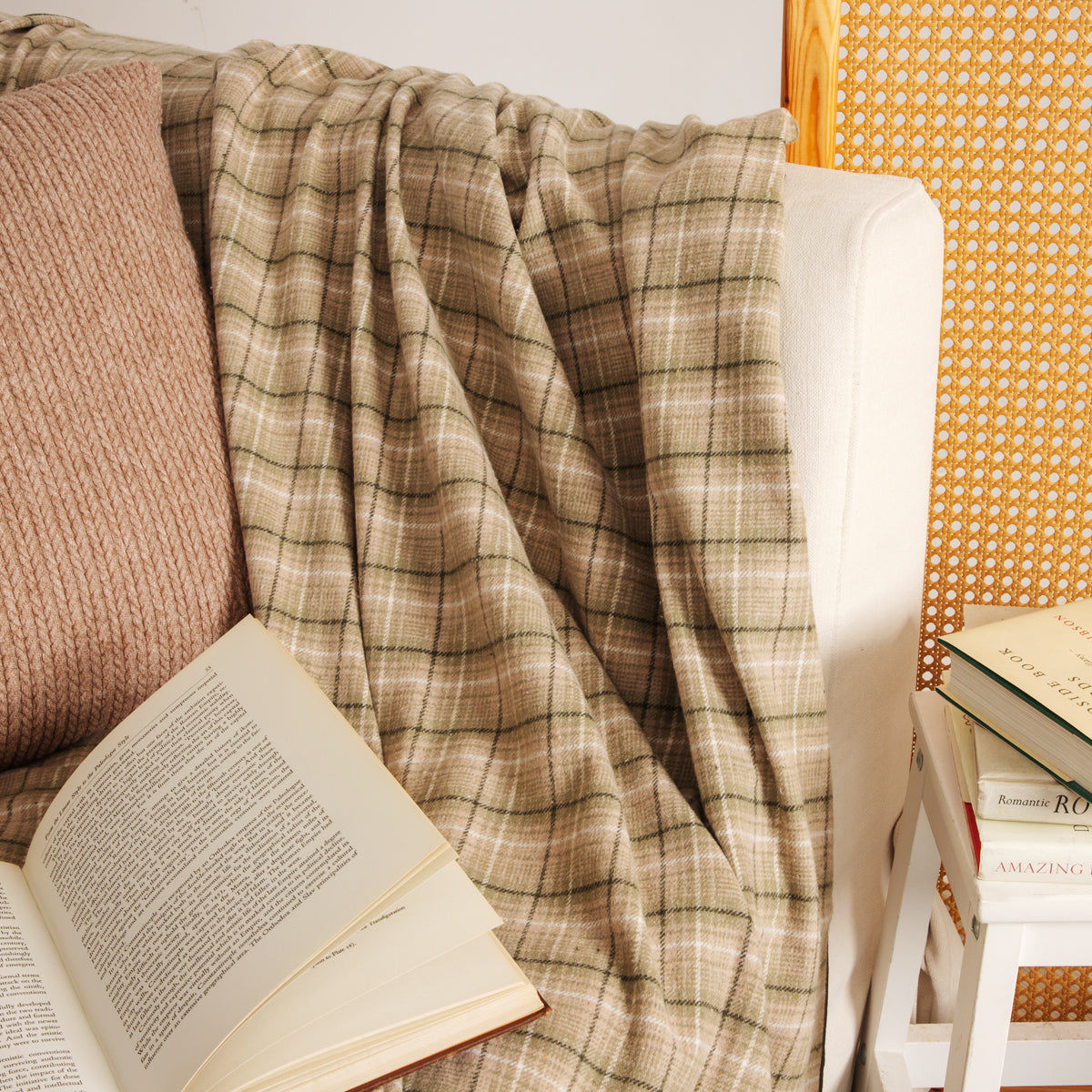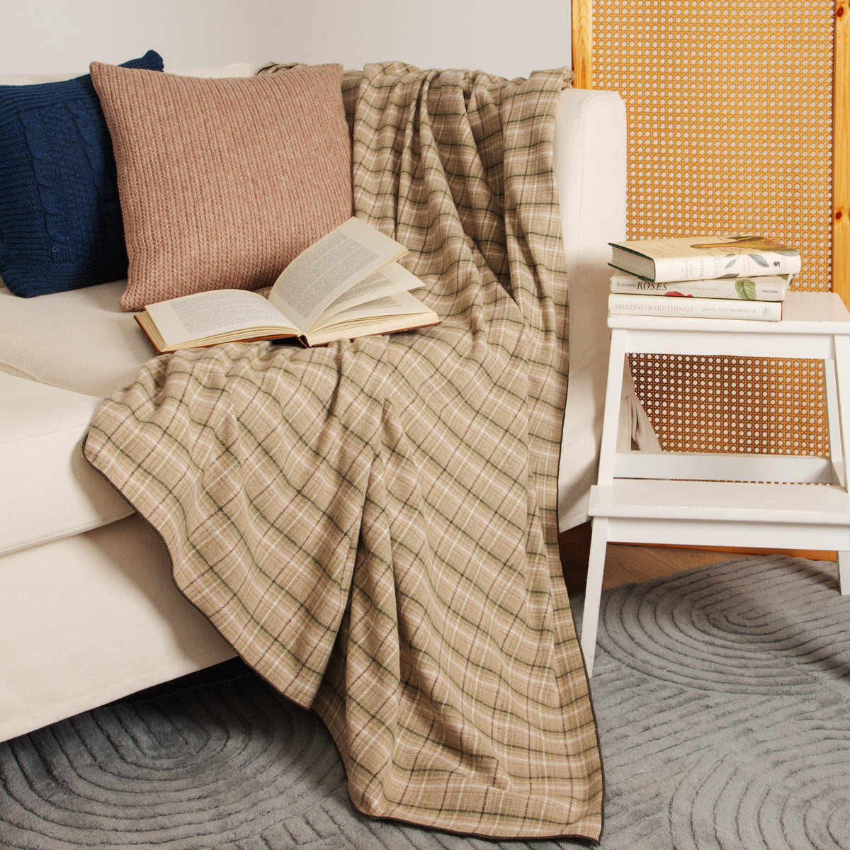 Κομψή κουβέρτα καναπέ καρό μπεζ απόχρωση με φεστόνι.