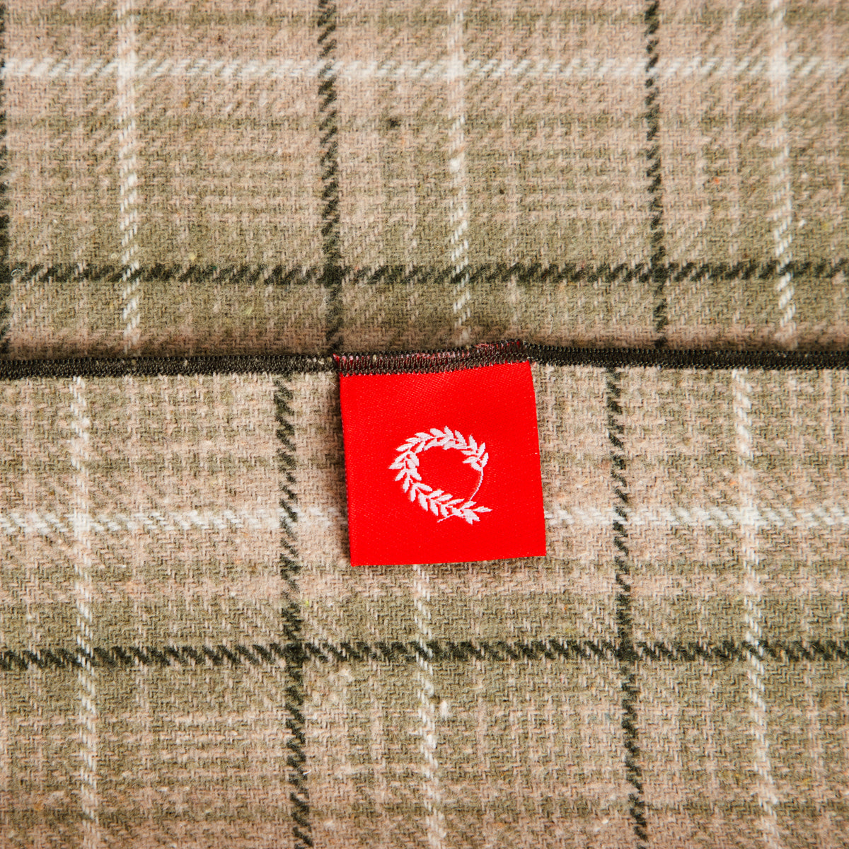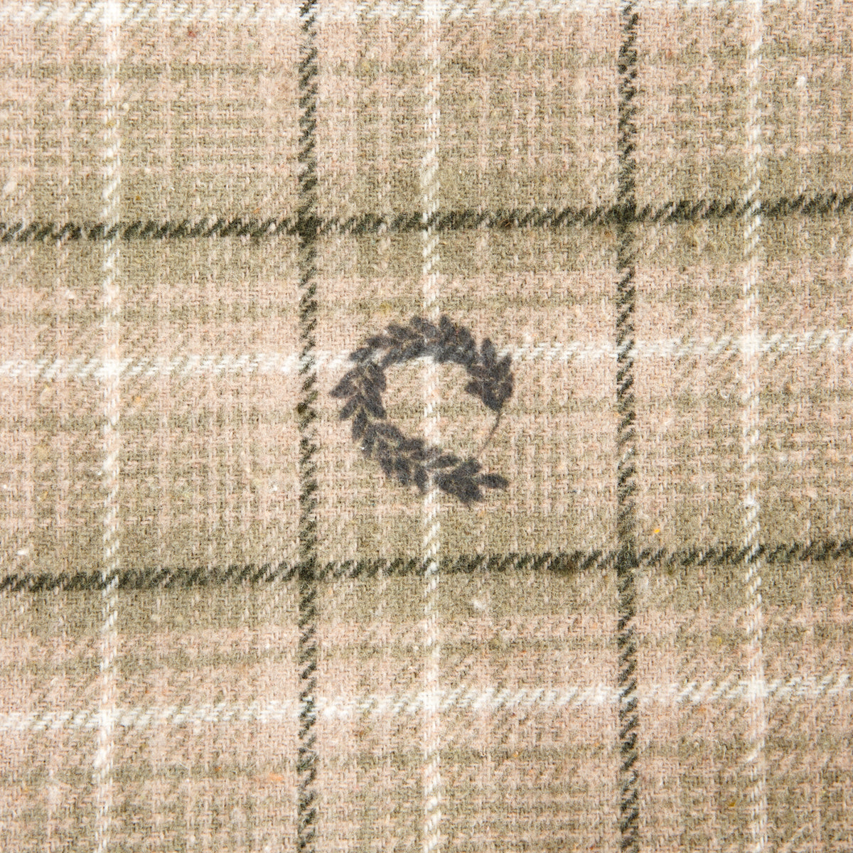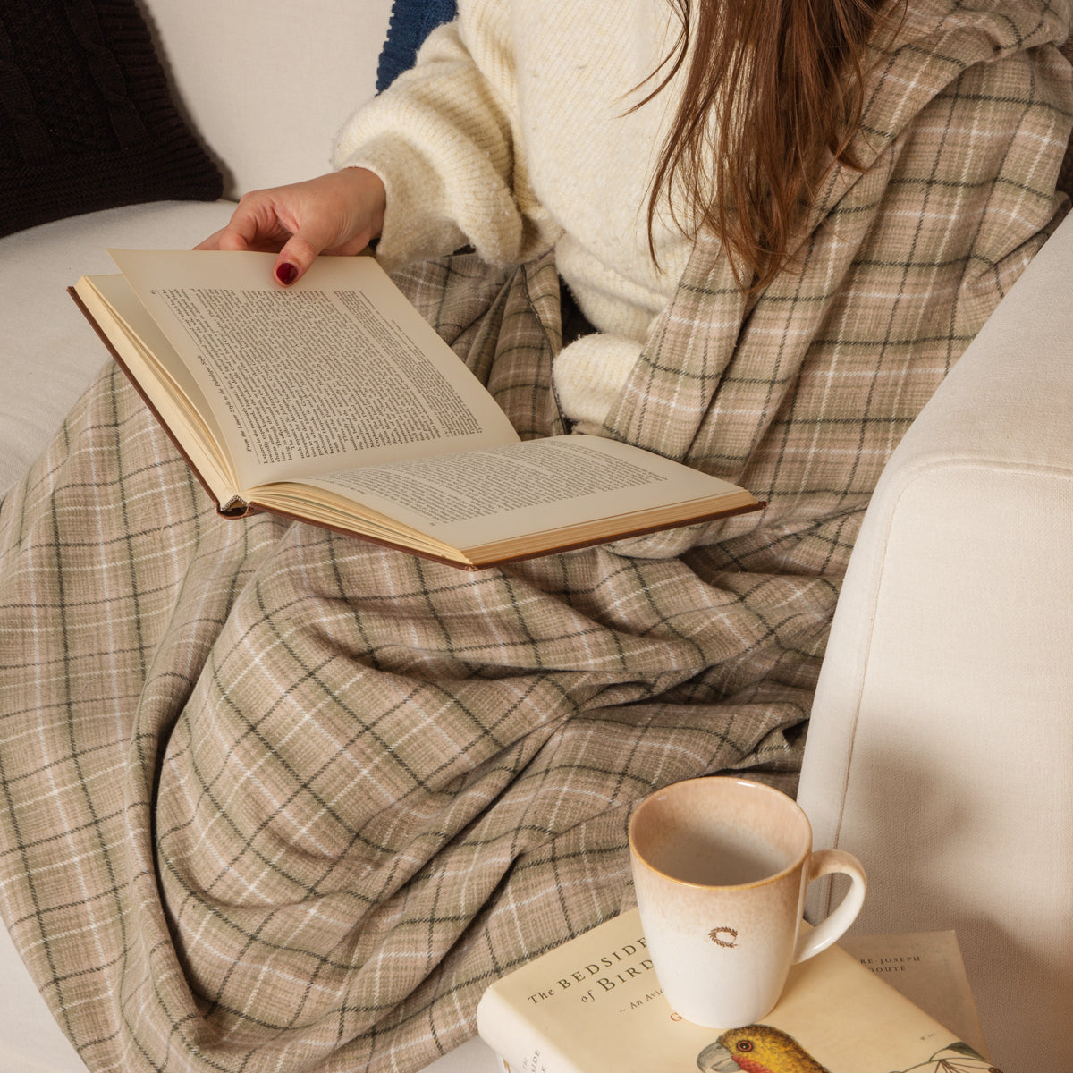 Κομψή κουβέρτα καναπέ καρό μπεζ απόχρωση με φεστόνι.
