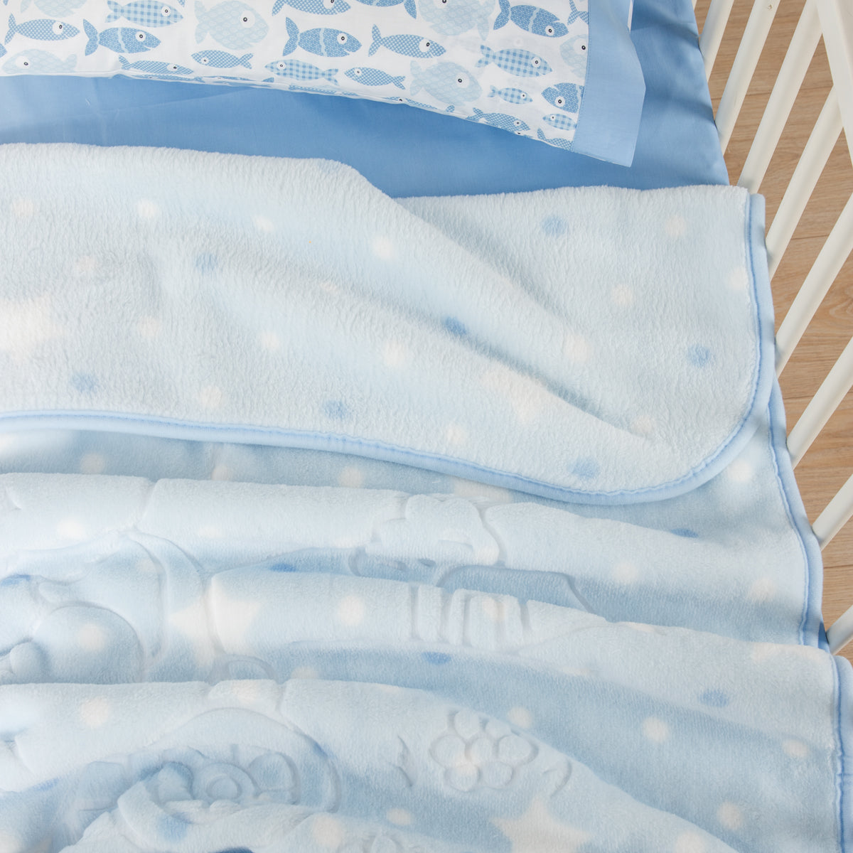 Εξαιρετικά απαλή και ζεστή βρεφική κουβέρτα κούνιας σε απαλό σιέλ, με ανάγλυφα σχέδια για άνεση και θαλπωρή τον χειμώνα.