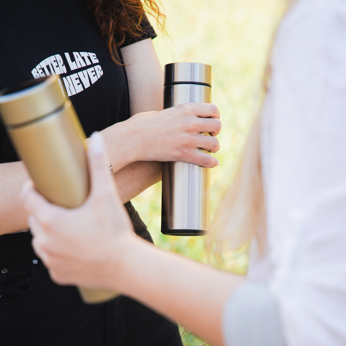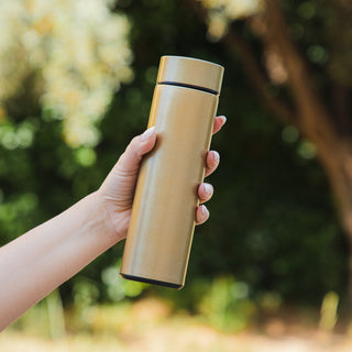 Κομψός και πρακτικός, ο θερμός διπλού τοιχώματος σε απόχρωση χρυσού είναι ιδανικός για το γραφείο, τη βόλτα ή το ταξίδι. Με χωρητικότητα 500ml, διατηρεί τα ροφήματά σας ζεστά ή κρύα για πολλές ώρες, χάρη στην ανοξείδωτη ισοθερμική κατασκευή του.